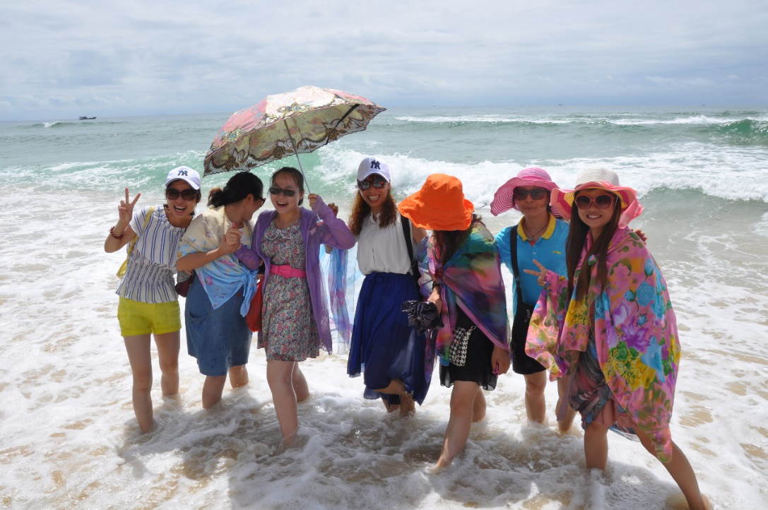 我們的女同事都披上了夏威夷風(fēng)格的海灘披巾,怕被炙熱的太陽曬傷,墨鏡、大遮沿太陽帽、太陽傘等裝備齊全。盡管毒辣的太陽也無法阻擋我們對大海的熱愛,趕緊脫掉鞋子去海水里走走,一起與大海拍照留念。