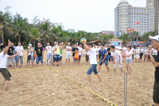 我們在黃金海岸舉行了沙灘排球、拔河、兩人雙足等眾多有利于團建的沙灘娛樂活動??纯次覀兊纳碁┡徘蛘l更厲害,首先姿勢要擺對,聽我口哨準(zhǔn)備發(fā)球啦!啦啦隊們?yōu)槲覀兊木时荣惡炔剩?/span>